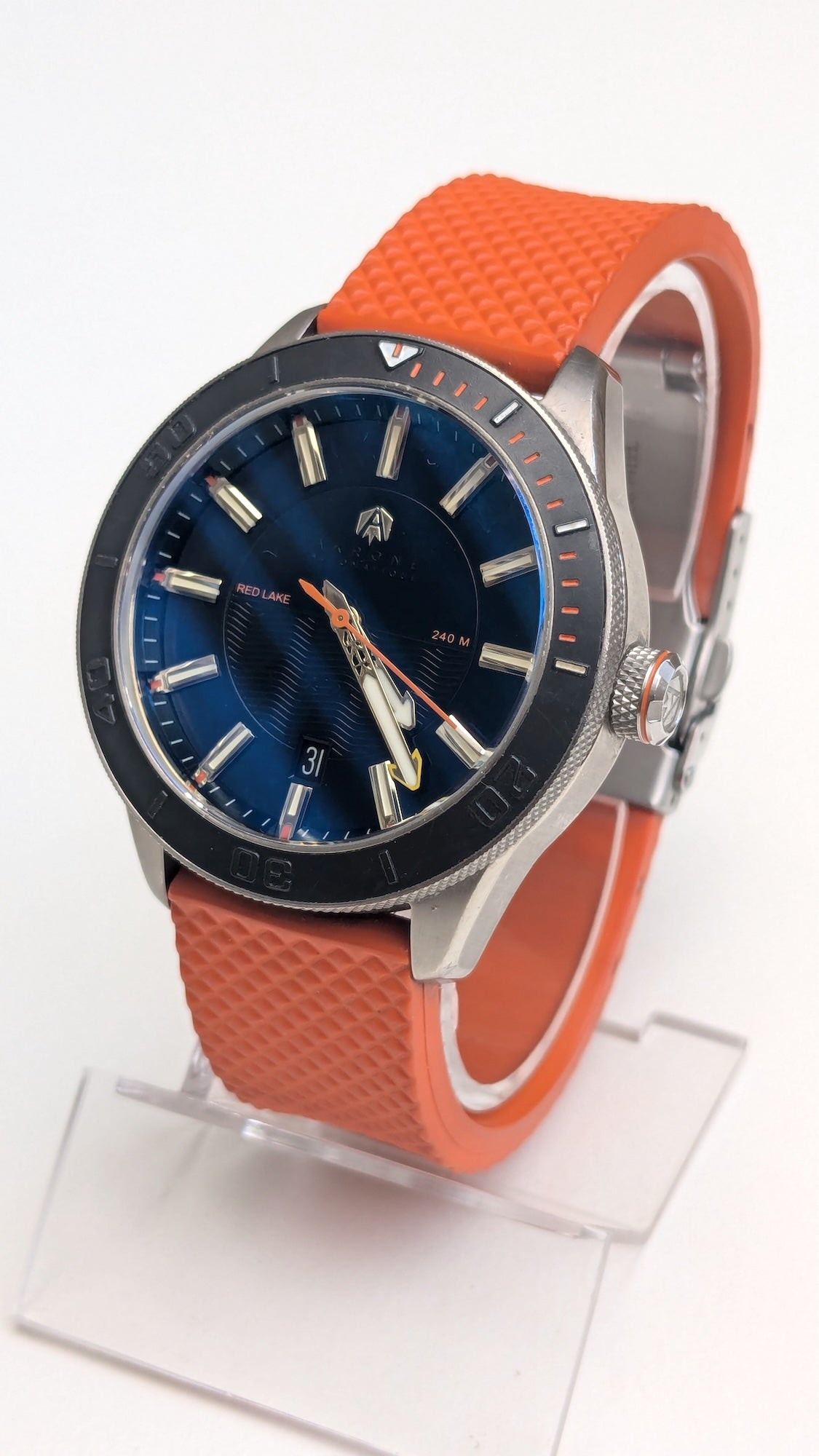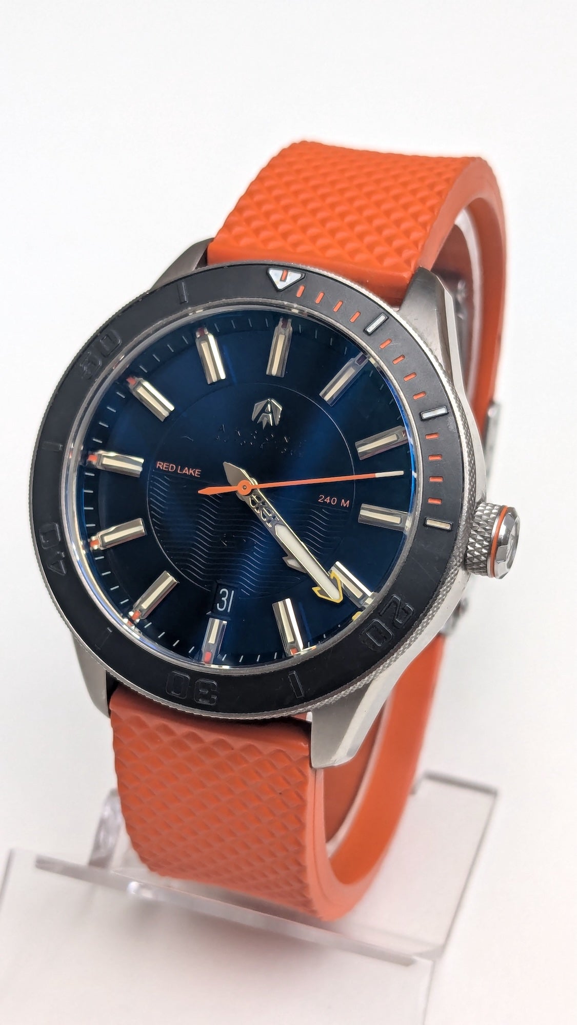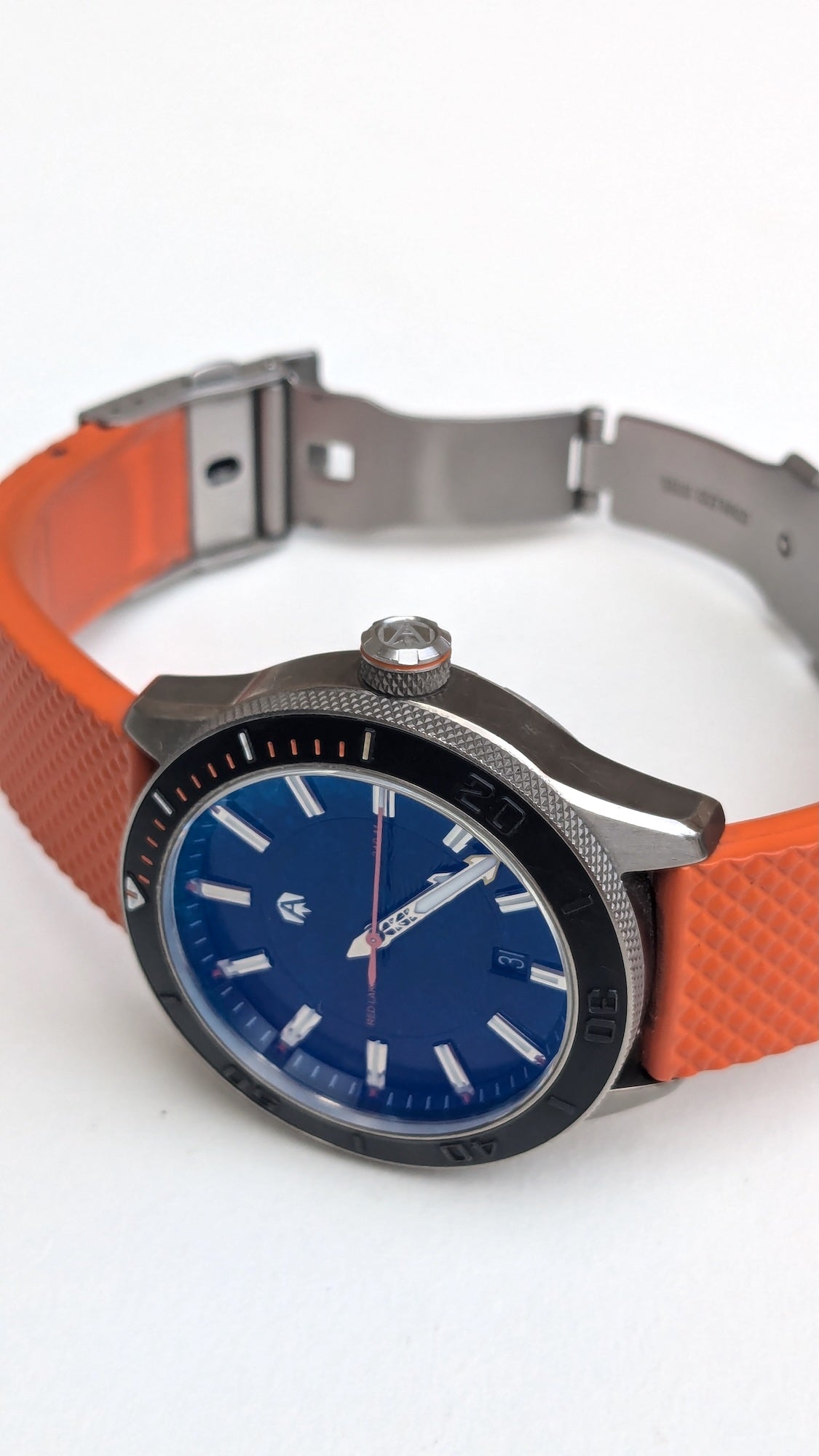 - Aiguilles : luminescentes, trotteuse orange